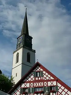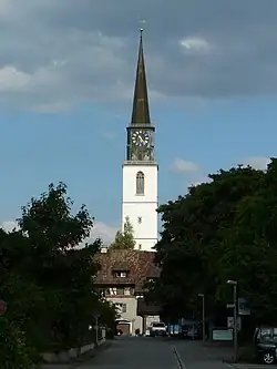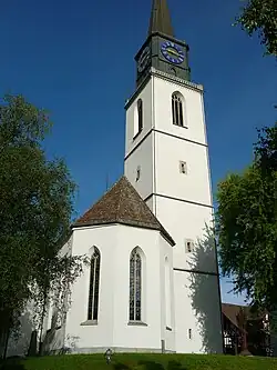 Nach einem Stadtbrand wurde die heutige Kirche in den Jahren 1508 bis 1510 im spätgotischen Stil erbaut. Der Turm erhielt ein Pyramidendach.[7] 1678 wurde das Kirchenschiff auf die heutige Grösse erweitert und zeitgleich sein heutiger Dachstuhl eingebaut. 1870/1871 wurde die Kirche durch Josef Utzinger in neugotischem Stil umgestaltet. 1999 wurden der Turmhelm und 2002 das Innere der Kirche renoviert.[8]