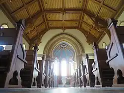 Neben dem Schnitzwerk sind auch die reichhaltigen ornamentalen Malereien und die Farbglasfenster typische Elemente neugotischer Sakralraumgestaltung. Der Taufstein von 1703 stammt aus der alten Kirche.