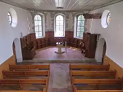 Das barocke Gotteshaus ist als Saalkirche mit nicht eingezogenem polygonalen Abschluss angelegt. Zu betreten ist sie über einen Frontturm, der in den 1830er Jahren erhöht wurde. Die Kirche wird durch Rundbogenfenster und Oculi über den Seitenportalen beleuchtet. Bemerkenswert sind die Grisaille-Malereien von 1676 rund um die Fenster, die an Dünz' Kirche von Gränichen erinnern. Auch das Chorgestühl, die Kanzel und der Taufstein stammen aus der Bauzeit und bilden ein bedeutendes Ensemble. Die Empore stammt aus der Vorgängerkirche und wurde 1812 erweitert. 1946–1947 wurden die Fenster im Schiff mit Glasmalereien von Paul Zehnder versehen.