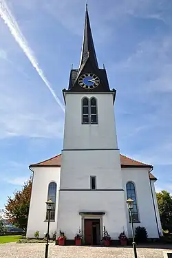 Die Kirche mit ihrem markanten schwarzen Spitzturmhelm erhebt sich auf einer Anhöhe über dem Dorf. Das Gotteshaus wurde 1820–1821 nach dem zu dieser Zeit für protestantische Kirchen beliebten Schema der quergerichteten Emporenhalle erbaut. Anders als bei Querkirchen des Rokoko münden die den Innenraum gliedernden Pilastern in ein Gebälk mit Zahnschnittfries und bekrönenden Vasen.