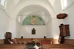 Die Apsis im Chor, in dessen Mittelpunkt ein auch als Abendmahlstisch dienender schmaler Taufstein steht, schliesst mit dem 1915 angefertigten Gemälde Am Morgen der Auferstehung des aus dem Bergell stammenden Künstlers Augusto Giacometti.