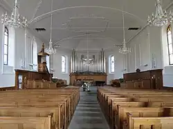 Die Beleuchtung der Kirche erfolgt vornehmlich durch klassizistische Kronleuchter. Der Taufstein und die mit Girlanden und einer Vase dezent verzierte hölzerne Kanzel stammen aus der Zeit der klassizistischen Neugestaltung von 1788. In dem um zwei Stufen erhöhten Chorraum sind Teile des Gestühls aus dieser Zeit erhalten.