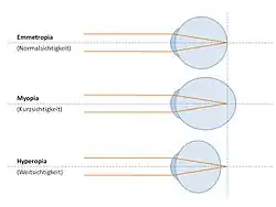 Von einem axialen refraktiven Sehfehler spricht man, wenn die Brennweite des optischen Systems des Auges nicht mit der Länge des Augapfels übereinstimmt. Ist der Augapfel im Verhältnis zur Augenbrechkraft zu lang, spricht man von Kurzsichtigkeit oder Myopie. Ein zu kurzer Augapfel führt zur Weitsichtigkeit oder Hyperopie. Astigmatismus, Hornhautverkrümmung oder Stabsichtigkeit tritt dann auf, wenn das optische System des Auges unterschiedliche Brennpunkte in unterschiedlichen Meridianen hat. Das Ausmaß einer Ametropie wird in Dioptrien angegeben. Kurzsichtige benötigen Zerstreuungslinsen mit negativer Brechkraft und Weitsichtige Sammellinsen mit positiver Brechkraft.