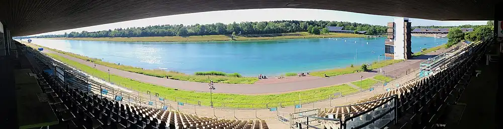 Die Tribünen mit dem Zielturm im östlichen Zielbereich besaßen während der Spiele 9.000 Sitz- und 16.000 Stehplätze sowie weitere Plätze für Ehrengäste, Presse, Rundfunk- und Fernsehkommentatoren. Im rückwärtigen Bereich dieser Anlage waren unter anderem mehrere Cafeterien, Kioske, Rundfunk- und Fernsehzentren, Presseräume, ein Postamt sowie ein Fernschreibraum untergebracht. Daneben gab es eine Ausstellung über die Entwicklung der Sportruderboote und Kanus mit zahlreichen Demonstrationsobjekten.[6]