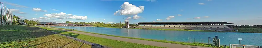 Regattastrecke Oberschleißheim (Ruderregatta München) mit Haupttribüne, Zielturm und Werkstätten