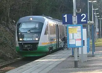 Nach ersten Versuchen mit Triebwagen wurde 1940[7] der Dieseltriebwagen VT 01 von der Dessauer Waggonfabrik geliefert. Dieses Fahrzeug ist erhalten geblieben und kann mit Stand 2019 in gutem nicht fahrfähigen Zustand im Triebwagenmuseum Dessau besichtigt werden. Bei Auslieferung war das Fahrzeug rot/beige lackiert.