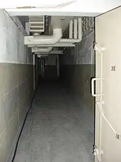 Gang im Bunker, oben ist die Belüftungsanlage sichtbar