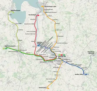 RS 2 Bremerhaven-Lehe – Bremerhaven Hbf –  Bremen Hbf – Syke – Twistringen 30' 60' 30'-Takt zwischen Bremerhaven-Lehe und Syke (Stand Juni 2025 Takt 60 mit einzelnen Verstärkerfahrten morgens und nachmittags zwischen Bremen Hbf und Bremerhaven-Lehe) 12/2010 – 12/2036