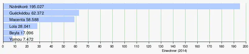 Einwohnerstärkste Ortschaft der Region ist die Hauptstadt Nzérékoré mit fast 200.000 Bewohnern. Weitere bedeutende Städte sind die weiteren Hauptorte der Präfekturen. Dies sind Guéckédou, Macenta, Lola, Beyla und Yomou.[3]