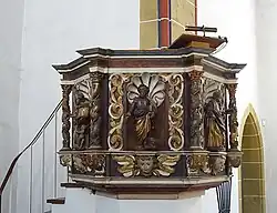 Die Kanzel (wohl 1687) stammt aus der Klosterkirche St. Pankratius Hamersleben und zeigt die vier Evangelisten.