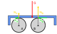 Die Masse des Stabes sei m und seine Gewichtskraft G = mg mit Schwerebeschleunigung g. Die Reibung habe den Gleitreibungskoeffizient μ, sodass zwischen Reibkraft RA und Normalkraft NA an der Rolle A bei vorhandenem Schlupf der Zusammenhang RA = μNA gilt und entsprechend für Rolle B.