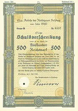 Anleihe über 500 RM des Reichsgaues Salzburg vom 1. Juli 1940 mit Faksimileunterschrift des Reichsstatthalters Friedrich Rainer