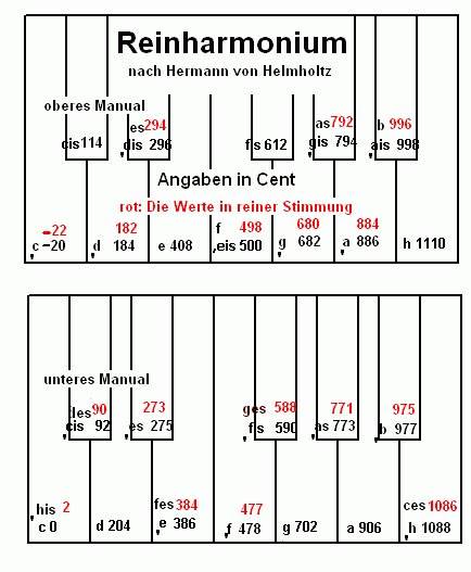 Hermann von Helmholtz, ein glühender Verfechter der reinen Stimmung, beschreibt[5] ausführlich (S. 516 ff.) über seine Studien am rein gestimmten Harmonium mit zwei verschieden gestimmten Manualen.