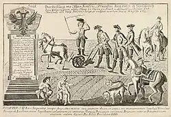 Das Treffen mit dem Erzfeind des Hauses Österreich, bei dem Joseph von acht Generälen begleitet war, fand im August in Schlesien statt. Auf der Fahrt dorthin ging bei Slavíkovice (Slawikowitz) in Mähren der Wagen des Kaisers zu Bruch. In der erzwungenen Ruhepause hatte Joseph seinen glücklichsten Einfall: Er nahm einem Bauernkrecht den Pflug aus der Hand und zog damit wie die Kaiser von China Furchen. Dadurch gab er sich nicht nur als Anhänger der Physiokraten zu erkennen, die (im Gegensatz zu den Merkantilisten) im Ackerbau die Grundlage der Volkswirtschaft sahen, sondern bekundete auch sein Mitgefühl für die Leibeigenen, welche gerade in den Ländern der Böhmischen Krone mit Frondienst (Robot) für den Adel überhäuft waren.[36]