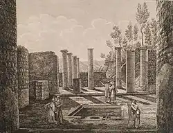 Es folgten anderthalb Wochen bei seiner Schwester Maria Carolina, die im Jahr zuvor Ferdinand IV. von Neapel geheiratet hatte. Der Kaiser ließ den ohne Erziehung aufgewachsenen König seine geistige Überlegenheit spüren, was diesen begreiflicherweise verstimmte. In Pompei, das er besichtigte, heißt eines der ausgegrabenen Häuser nach ihm.[31] Anschließend leistete er fünf Wochen lang seinem Bruder in Florenz Gesellschaft, der sich von der Pockenimpfung erholte.[32] Schon 1768 hatte sich Joseph ausgemalt, wie sie den ganzen Tag in der Villa La Petraia zusammen sein würden – im Frack, ohne Degen, einen Strohhut auf dem Kopf.[33] Zwischendurch besuchte er Parma, dessen Herzog Josephs Schwester Amalia heiraten sollte.