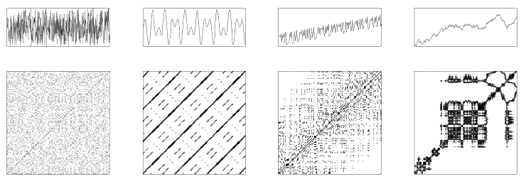 Der Rekurrenzplot ist eine quadratische Matrix mit zwei Zeitachsen[1]. In dieser Matrix sind durch Punkte diejenigen Zeitpaarungen dargestellt, deren Zustände nahezu gleich sind, d. h. wann der entsprechende Zustand wiedergekehrt ist. Die Wiederkehr wird in der Regel aus der Distanz zwischen allen Paarungen der Daten bestimmt[3]: