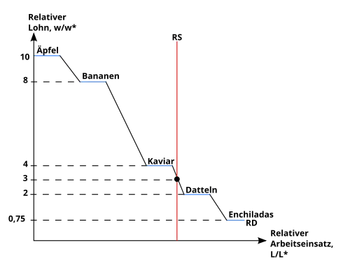 Der relative Lohn befindet sich dort im Gleichgewicht, wo sich RS und RD schneiden. Wenn sich RS und RD auf einem flachen Abschnitt (siehe blaue Linie in der Abbildung) im Gleichgewicht befinden, dann produzieren beide Länder dieses Gut.