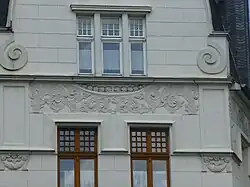 Das Gebäude besitzt einen unregelmäßigen Grundriss. Während der südliche Gebäudetrakt eine trapezförmige, mit einer zur Straßenkreuzung hin abgestumpften Front aufweist, bildet der etwas abgewinkelte und sich an die Nachbargebäude anschließende Teil des Hauses ein Rechteck. An der Schnittstelle beider Gebäudeteile befindet sich ein Mittelrisalit mit Ziergiebel im Mansardbereich.