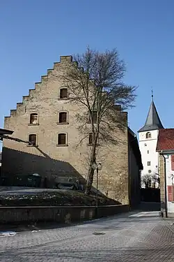Der Flügelbau wird von einem Treppenturm flankiert, der zum 1807 abgerissenen nördlichen Gebäudeflügel gehörte.