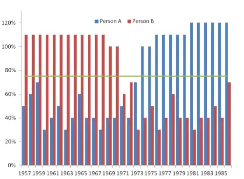Beide Personen erfüllen die Zugangsvoraussetzungen (mehr als 25 Beitragsjahre). Im Durchschnitt ihres gesamten Erwerbslebens haben beide Rentenanwartschaften die 75 Prozent des Durchschnittseinkommens entsprechen. Person A hat in der Zeit vor 1973 durchschnittlich 45,9 Prozent und Person B von 97 Prozent des Durchschnittseinkommens. Damit liegt Person A unter und Person B über der Marke von 75 Prozent für den relevanten Zeitraum vor 1973. Dadurch bekommt Person A zusätzliche Rentenanwartschaften, welche der Differenz von 29,1 Prozent (75 Prozent minus 45,9 Prozent) für 17 Jahre entsprechen. Im Ergebnis wird die Rentenanwartschaft der Person A insgesamt um 22 Prozent erhöht. Person B hingegen bekommt keine zusätzlichen Rentenanwartschaften und hat damit bei gleicher Beitragsleistung am Ende eine niedrigere Rente. Auch eine Person, die durchgängig 75 Prozent verdiente, würde nicht aufgestockt und bekäme ebenfalls bei gleicher Beitragsleistung niedrigere Rente.