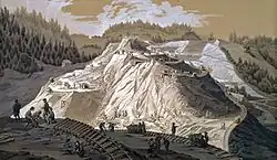 Im Jahr 1847 begann der Bau des Damms. Zuerst wurden Eisenpfähle zur Stabilisierung in den moorigen Untergrund gerammt.[3] Danach folgte die Aufschüttung, sowohl von der Oberhäuserer Seite als auch vom Eisenberg her (Ellhofener Seite). Mit Schubkarren, Loren und Rutschen bewegten in sieben Jahren Bauzeit über 3000 Arbeiter – von Hand – etwa 2,24 Millionen Kubikmeter Erdreich.[5][6] Das benötigte Schüttmaterial wurde an umliegenden Hängen und vom südlich gelegenen Eisenberg abgebaut. Der Eisenberg wurde bis auf die Höhe des Bahndamms abgetragen. Der Einsatz von Nutztieren war wegen des instabilen Untergrunds und der teils steilen Lage nicht möglich.