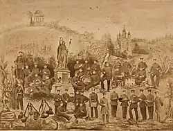 Reservistentreffen im Jahr 1881 auf einer fotografischen Collage, dargestellt am Germania-Kriegerdenkmal am Eingang zum Wiesbadener Nerotal vor der gemalten Kulisse des Nerobergs