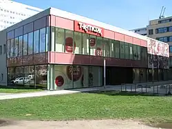 Das Restaurant Bastei an der Prager Straße in Dresden ist ein Flachbau mit einem denkmalgeschützten Wandgemälde.