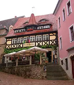 Das Gebäude unter der Adresse An der Frauenkirche 12 ist eines der wenigen Fachwerkhäuser in der Meißner Altstadt. Es wurde 1523 im Stil der Renaissance durch Meister Valentin als Zunfthaus der Tuchmacher erbaut.[2] Als solches diente es über drei Jahrhunderte. 1838 erwarb es der Herbergsvater und Küster der Frauenkirche. Als Schenke bekam es das Branntwein- und Braurecht.