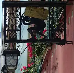Das schmiedeeiserne Wirtshausschild zeigt zwischen zwei stilisierten Pflanzentöpfen die schwarze Silhouette eines Lastträgers. Er trägt auf seinem tiefgebeugten Rücken eine goldene Kiste, der das Wirtshaus seinen Namen verdanken soll. Nach der Sage geht der Name auf eine Hafertruhe zurück, die zum Füttern der Pferde vor dem Haus stand (siehe auch Wilhelm Hauff). Nach einer anderen Überlieferung sollen Studenten zum Zeichen des königlichen Darlehens, das der Wirt erhalten hatte, über ihrem Stammplatz in der Wirtschaft eine vergoldete Kiste aufgehängt haben.