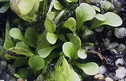 Zwei Blatttypen sind zu unterscheiden, nämlich die oberirdischen assimilierenden grünen Blätter und die bleichen, wurzelähnlich aussehenden unterirdischen Fallen, die Reusenblätter („Rhizophylle“).