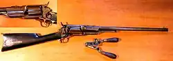 Es kam auch zu Kuriositäten wie dem 1859 von John Walsh entwickelten Revolver, der in sechs Kammern jeweils zwei Ladungen hintereinander einbrachte. Somit standen dem Schützen zwölf Schuss zur Verfügung. Le Mat (New Orleans) erfand den neunschüssigen LeMat Percussion Revolver mit einem Zusatzlauf für einen Schrotschuss.[35] Enouy Joseph entwickelte 1855 sogar einen 42-schüssigen Revolver. An einer Spindel befanden sich sieben Trommeln mit je sechs Kammern. Die Waffe war jedoch zu groß, um wirklich praktisch zu sein.[36]