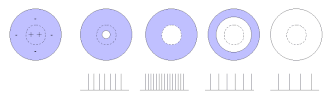 • Sehschärfe: Circa 120 Millionen Stäbchen und sechs Millionen Zapfen konvergieren auf eine Million Ganglienzellen. Die rezeptiven Felder für Zapfen sind viel kleiner und damit die Sehschärfe bei ihnen größer. Die etwa 60.000 Zapfen in der Fovea nehmen dabei eine Sonderrolle ein, da sie nicht konvergieren, sondern direkt auf ihre "eigenen" Ganglienzellen projizieren. Deshalb ist die Fovea der Ort des schärfsten Sehens, während zur Peripherie des Auges hin die rezeptiven Felder größer sind und die Sehschärfe geringer ist.