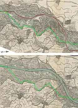 1817 nahm die badisch-französische Rheingrenzberichtigungskommission ihre Arbeit auf. Die Tätigkeit der Kommission war überaus schwierig, da die Pariser Verträge Unklarheiten aufwiesen und die geforderte Rekonstruktion der Verhältnisse von 1801 durch die zwischenzeitlich eingetretenen topografischen Änderungen ebenso aufwändig war wie der Nachweis der Rechtstitel durch die Gemeinden. Als Bann- und Eigentumsgrenze entstand an der gesamten badisch-französischen Grenze ein Polygonzug mit 120 Punkten, der mehrfach den Rheinlauf kreuzte. Im Gebiet von Rhinau waren die Arbeiten 1823 im Wesentlichen beendet; hier verlief die Bann- und Eigentumsgrenze östlich des Rheins. Ein Grenzvertrag zwischen Baden und Frankreich vom 5. April 1840 bestätigte die Staats- sowie die Bann- und Eigentumsgrenze und enthielt zugleich Bestimmungen über die Korrektionsarbeiten, die 1840 nach den Plänen von Tulla eingeleitet wurden. Durch die Rheinkorrektion wurde bis 1879 ein einheitliches Flussbett geschaffen, in dem fortan der Talweg verlief.[15]