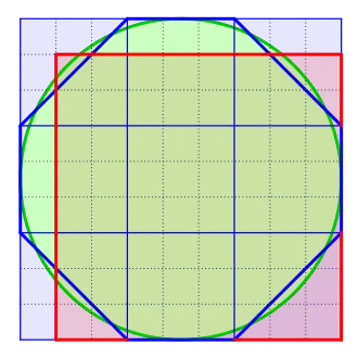 Für das im Papyrus Rhind wiedergegebene Verfahren kann die Annäherung an die Kreiszahl also aus dem Verhältnis der Flächeninhalte eines eingeschriebenen Kreises und seines umschreibenden Quadrates errechnet werden,