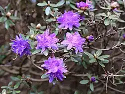 Die Rhododendren (Singular laut Duden: der oder das Rhododendron,[1] von griechisch ῥόδον = rhodon „Rose“ und δένδρον = dendron „Baum“)[2] sind eine Pflanzengattung innerhalb der Familie der Heidekrautgewächse (Ericaceae).[3][2][4] Sie ist mit über 1000 Arten[5][3][2] eine vergleichsweise große Gattung. Eine Vielzahl von Sortengruppen und eine fast unüberschaubare Zahl von Sorten, welche teils Hybriden, teils nur vegetativ vermehrbare Ausleseformen (sogenannte Sports) sind, werden als Zierpflanzen in Parks sowie Gärten und als Zimmerpflanzen verwendet.[6]