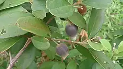 Die eiförmigen bis rundlichen, vielsamigen Beeren, die Ähnlichkeiten zu Heidelbeeren aufweisen, sind im reifen Zustand dunkelviolett und essbar. Unreife Früchte sind grün. Sie haben eine Länge von 10 bis 15 Millimetern und sind mit einem haltbaren Kelch gekrönt. Sie besitzen 40 bis 45 Samen, die etwa 2 Millimeter lang und abgeflacht sind.[3]