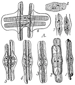 - ↑ Ryan W. Drum, Stuart Pankratz: Fine structure of an unusual cytoplasmic inclusion in the diatom genus, Rhopalodia, in: Protoplasma, Band 60, S. 141–149, März 1965, doi:10.1007/BF01248136.