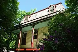 Das Haus ist im Stil des Second Empire erbaut und das Mansarddach ist mit diamantförmigen Schindeln gedeckt.[1] Das ist durch ein eingebettetes Gesims von der Fassade abgesetzt, Ziergiebel schmücken die Vorderseite der Dachgauben, die Dachtraufe ist paarweise mit Auskragungen versehen.[2] Die Fenster des Hauses sind an der Oberkante mit einem Bogen abgeschlossen, ein Gesims befindet sich oberhalb jedes Fensters.[2] Die Konstrukteure des L-förmigen Hauses verwendeten bei dem zweistöckigen Bauwerk die Bauart des balloon framing, wobei das Bauholz lang genug war, um vom Sockel bis zum Dach des Hauses statt nur bis zum Boden des nächsten Geschosses zu reichen.[2][3]