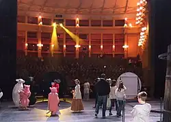 Der Zuschauerraum ist von Scherwänden flankiert. Diese setzen sich in einem doppelten Proszenium fort, das angelegt wurde, um den optischen Eindruck zu erwecken, die Bühne sei weiter entfernt, als sie es in Wirklichkeit ist.
