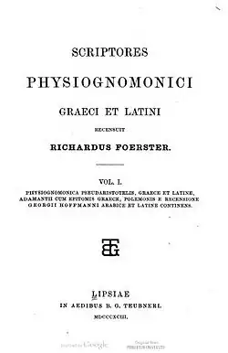 - ↑ Berichtigungen bieten Jacques André: Anonyme Latin Traité de Physiognomonie. Paris 1981. Giampiera Raina: Pseudo Aristotele: Fisiognomica; Anonimo Latino: Il trattato di fisiognomica. Milano 1993. Zweite Auflage. Milano 1994. Ian D. Repath: Notes on the Text of the Scriptores Physiognomonici. In: The Classical Quarterly. New Series. Band 56, 2006, S. 603–606. Robert G. Hoyland, Simon Swain u. a. (Hrsg.): Seeing the face, seeing the soul. The art of physiognomy in the Classical and Islamic Worlds. Oxford 2007.