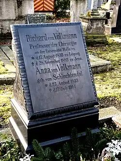 Er trat eine Assistentenstelle bei Ernst Blasius an der alten Chirurgischen Universitätsklinik am Domplatz in Halle an und habilitierte sich 1857.[4] Während einer langen Erkrankung von Blasius vertrat er ihn in der Leitung der Klinik. Wegen der zunehmenden Spannungen mit dem zurückgekehrten Blasius verließ Volkmann die Klinik und den Lehrkörper der Universität und ließ sich in Halle als praktischer Chirurg nieder. 1863 kehrte Volkmann als außerordentlicher Professor an die Universität zurück. Am Krieg gegen Österreich 1866 nahm er als Chefarzt des Lazaretts Trautenau in Böhmen teil. 1867 wurden Volkmann das Ordinariat für Chirurgie und die Leitung der Chirurgischen Universitätsklinik übertragen. Während des Krieges gegen Frankreich 1870/71 war er als konsultierender Generalarzt beim IV. Armee-Korps, später an der Maas und bei der Südarmee eingesetzt. Im Krieg zog er sich eine Syphilis zu, die zur Tabes dorsalis führte.[5][6] Am 4. Mai 1885 von Preußens König Wilhelm I. nobilitiert[7], starb er vier Jahre später an einer Pneumonie. Sein Grab befindet sich auf dem hallischen Stadtgottesacker.[8]