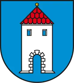 Blasonierung: „In Blau ein schwebender, betagleuchteter silberner Turm mit schindelgedecktem roten Spitzdach, goldenem Knauf, offenem Tor und zwei Fenstern.“