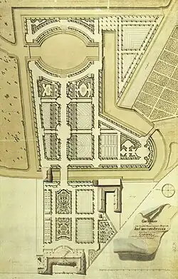 Der Garten begann am Haus mit einem großzügigen Parterre. Dieses bestand aus zwei Zierstücken mit beschnittenen Taxusbäumen und war von zwei Alleen begrenzt. Die Außenseite der linken Allee säumten Obstbäume, während die breitere Seite neben der rechten Allee von Beeten bedeckt war. Die Alleen endeten unter Torbögen auf einem Querweg, von dem eine Brücke über die Alte Parthe führte. Nördlich der Brücke überspannte ein Gewächshaus den Fluss.