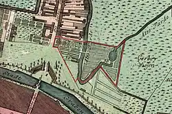 Nach der Brücke führte eine Kastanienallee bis zu einem ovalen Teich, der durch künstliche Verbreiterung der Alten Parthe entstanden war, die hier den Garten zum zweiten Mal kreuzte. Während die Kastanienallee von Gemüsebeeten flankiert war, war die Umgebung des Teiches wieder anspruchsvoller gestaltet.