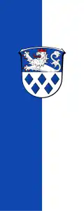 Flaggenbeschreibung: „Auf blau-weißer Flaggenbahn in der oberen Hälfte aufgelegt das Gemeindewappen.“[26]
