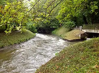 ![]() Riehenteich kurz nach dem Schliessi-Wehr bei der Einleitung des weiter flussaufwärts ebenfalls aus der Wiese abgezweigten Neuen Teichs (rechts) | ||