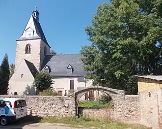 Die Gründung der Kirche soll auf das Wirken des angelsächsischen Missionars Wigbert zurückgehen. Der älteste, noch erhalten gebliebene Teil der Kirche stammt aus der Zeit um 1150. Das Holztonnengewölbe ist mit einer barocken Deckenmalerei versehen. Die Kirche hat einen barocken Altar. Die Orgel, ein Werk des Orgelbaumeisters Wilhelm Maurer aus Rettgenstedt bei Kölleda, stammt aus dem Jahre 1829.