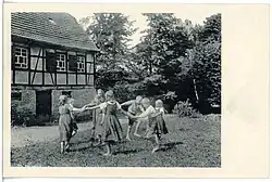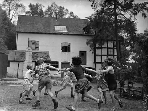 - ↑ Vgl. Fotografie aus Wiltshire in England (1942). In diesem Fall stehen zwei Kinder in der Mitte des Rings.