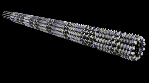 In der Verfahrenseinheit können, wie auch bei anderen Extrudertypen, Schnecken- und Gehäuseelemente modular ausgewählt werden. Dadurch ergibt sich die Möglichkeit einzelne Elemente zu einer Schneckenkonfiguration zu kombinieren und so Funktionszonen entlang des Verfahrensteils zu definieren. Diese Funktionszonen werden dann von passend ausgewählten Gehäuseelementen umschlossen und sind auf bestimmte Grundoperationen, wie z. B. Fördern, Mischen oder Kneten, ausgerichtet. Durch die Unterteilung des Gehäusezylinders ergeben sich getrennt regelbare Temperaturzonen, die gezielt an die jeweiligen Prozessschritte angepasst werden können. Der zentrale Kern der Verfahrenseinheit wird ebenfalls aus einzelnen Segmenten gebildet und ist über die Kernwelle mit flüssigen Medien temperierbar.