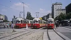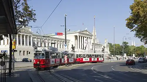![]() Zug der Linie 1 vor dem Parlament am äußeren Ring, kurz vor Erreichen der Haltestelle Dr.-Karl-Renner-Ring | |||||||||||||||||||||||||||||||||||||||||||||||||||||||||||||||||||||||||||||||||||||||||||||||||||||||||||||||||||||||||